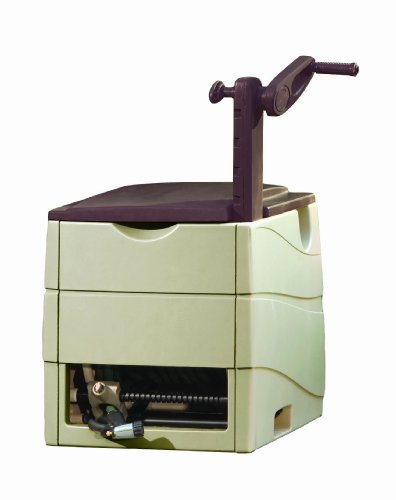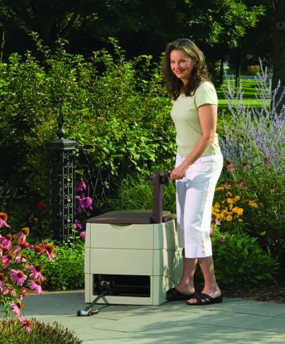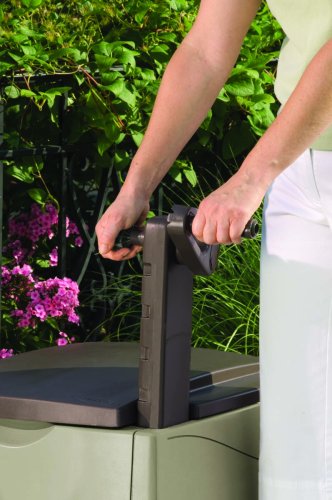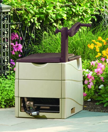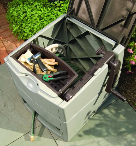 -. Feature : Color: Light Taupe/Mocha / Size: 23"H x 23"W x 24"D / Watertight Connection / Made in the USA / Sturdy Resin / Easy reach hideaway hose reel / Ergonomic raised crank arm for compact storage / Storage bin provides place to store small watering accessories / Easily crank and store up to 225 feet of garden hose / Measures 24-inch length by 23-inch width by 23-inch height
