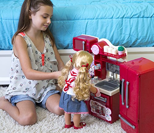 The Our Generation Gourmet Kitchen Set is packed with all of the essentials your doll needs to cook up a storm. Everything from baking muffins and grilling hamburgers, to cleaning up the mess afterwards, is at her finger tips. This realistic and completely playable kitchen is fully compatible with most 18" dolls, including American Girl dolls and accessories. Includes 1 kitchen, 1 fridge, 1 dish rack with tray, 3 canisters with lids, 1 measuring cup, bowls & plates, and food for any time of the day depending what you’re in the mood for - juice, hamburgers, sandwiches, ice cream, popsicles and much, much more! Doll not included. Our Generation is dedicated to a new, multifaceted generation of girls who are playing hockey, getting involved in charities, dressing fashion-forward, and still finding time to, you know, be kids! For every sale made, a portion of the proceeds goes to Free The Children's Power of a Girl Initiative to help provide an education to girls in developing countries. All dolls, clothes and accessories are made with safe, carefully-chosen, high-quality material. Ages 3 years and up.