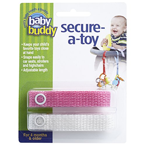 Secure-A-Toy 2 pack: Best Seller. Never lose another baby toy. These simple straps provide a safe attractive method for keeping baby's toys close at hand. Just snap one end to the child's toy and the other end to car seat, stroller, high seat, etc. Machine washable. Assorted colors. Made in USA.