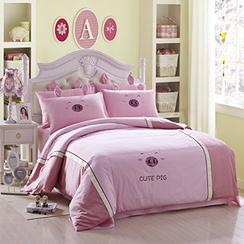 YOYOMALL 100% Cotton Cute Pig Pink Bedding Set,Delicate Embroidered Patch Craft Cover Set for Kids Twin Queen Size. (Twin)