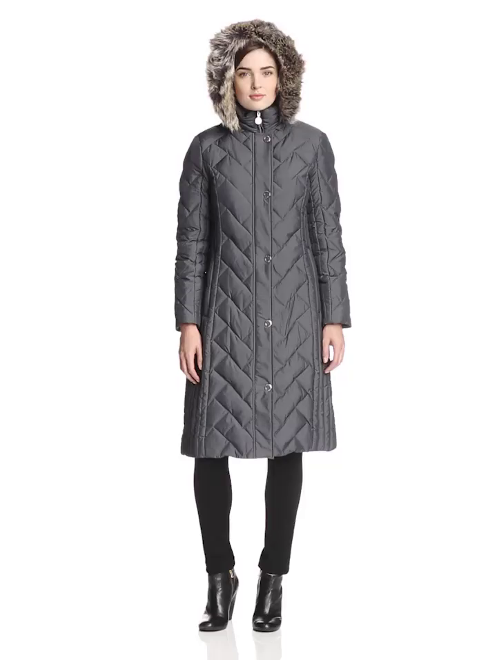 Quilted down coat featuring removable faux fur-trimmed hood with stand collar and side-entry zip pockets at waist Snap placket with concealed zipper Knit storm cuffs 42-inch center back length Brand : Anne Klein Item model num : 3811036F EAN : 0723088915140 Product Dimensions(LxWxH) :