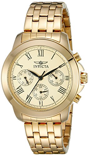 Gleaming in a high polished 18-karat gold plated stainless steel design, this Specialty timepiece from Invicta makes for a fantastic accessory that will dress up any woman's wardrobe. The gold-tone, multi-function dial with classic Roman numerals combines tradition with modern style in a harmonious balance.