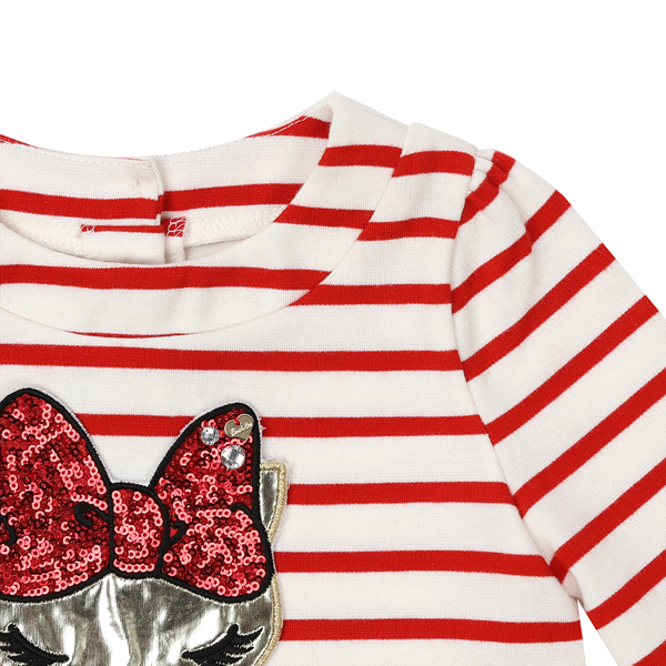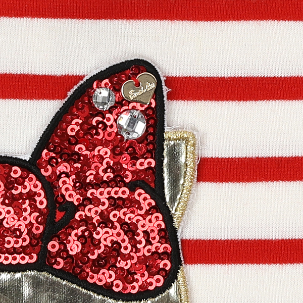 상품설명 레드 스트라이프 탑입니다. 소매끝단에 러플이 멋스러우며, 가슴에 골드 고양이와 리본포인트가 프렌치캣만의 큐트함을 더했습니다. 데님 시리즈와도 코디가 잘되며, 레드 치마바지, 또는 레드 주름스커트와 코디하시기 좋습니다.