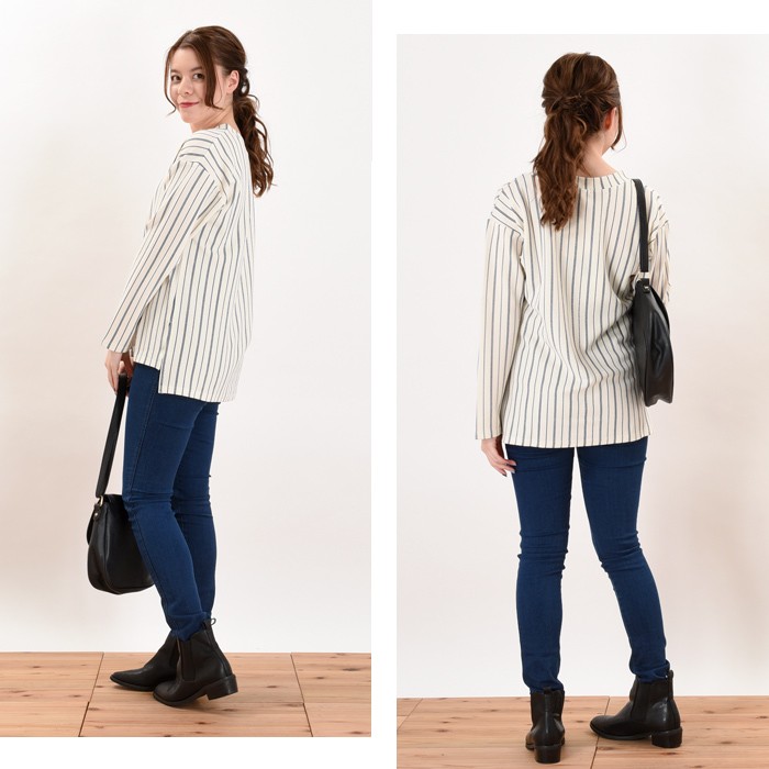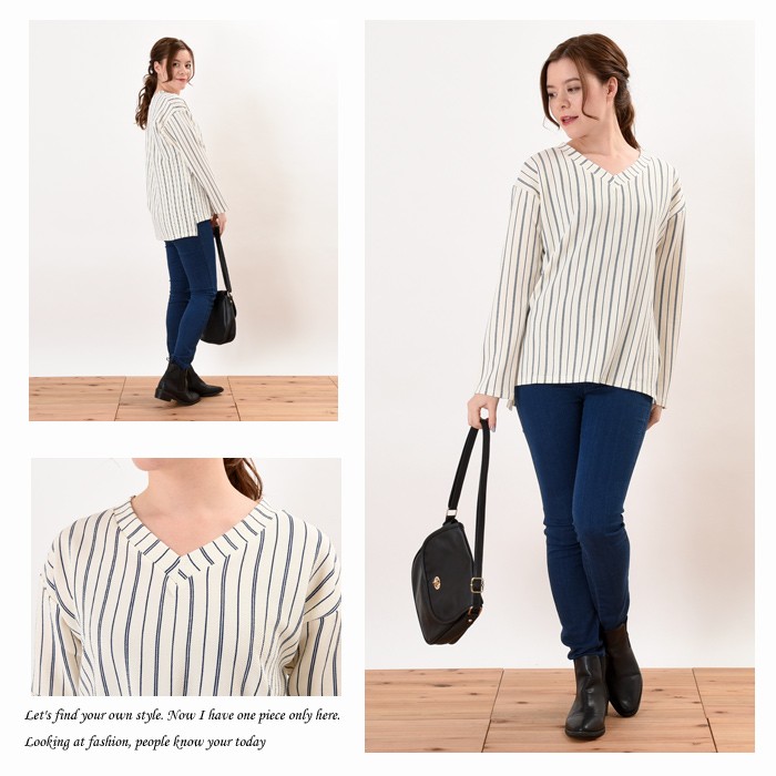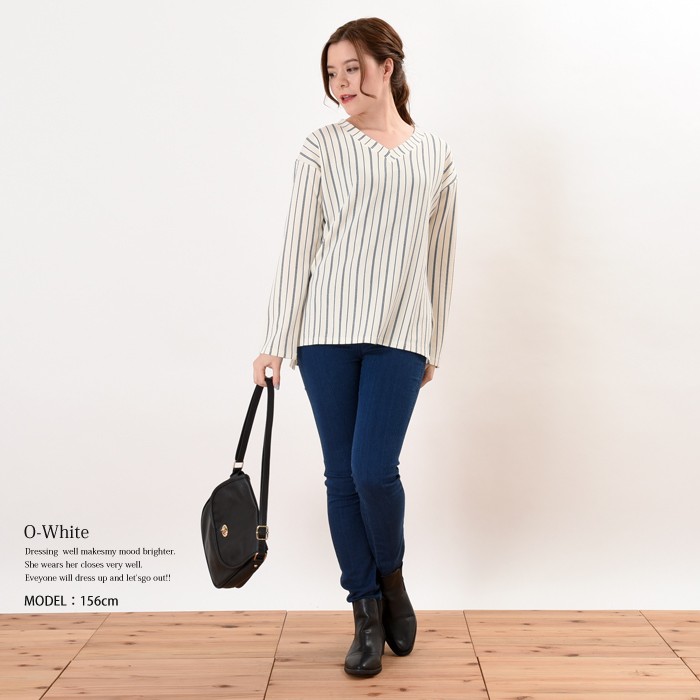 ★着やせ効果抜群!首回りすっきり/ストライプ柄プルオーバ-★立体的な生地感で、ふっくらとオシャレな雰囲気のふくれジャガード生地のプルオーバ-です。シンプルで着回しやすいストライプ柄は、コーディネートに取り入れやすいので、幅広い年齢層の方に大人気です♪短めな丈感なので、パンツにもスカートにも合わせやすく幅広いコーディネートに着まわせます!▼サイズ▼Mサイズ バスト:79~87cm/ウエスト:64cm~70cm/着丈:62/67cmLサイズ バスト:86~94cm/ウエスト:69~77cm/着丈:63/68cm▼素材▼ ポリエステル97%・ポリウレタン3%※注意事項※商品画像はできる限り実物の色に近づけておりますが、モニター・パソコン等の画像解像度により実際の商品と多少色味が異なる場合がございます。色味が異なるなどのクレームはお受けできませんのでご了承ください。海外・機械による生産のため、生地の継ぎ目に若干のズレや多少のほつれによる、形やサイズに多少の誤差が生じる場合がございます。また、混紡繊維によって生地の織りの他繊維が混紡している場合がこざいますが品質上の問題はございません。予めご了承くださいますようお願いいたします。
