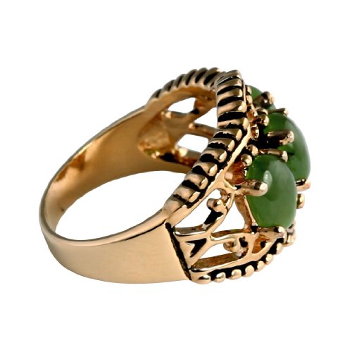 -. Title : Oval Genuine Green Jade Antiqued 14k Yellow Gold-Plated 3-Stone Filigree Ring