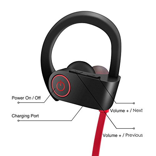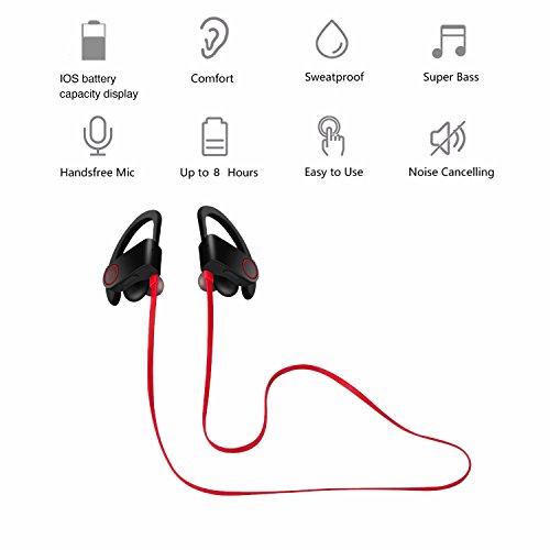 -. Feature : HD Stereo Sound: The bluetooth headphones with Built-in HD Microphone and CVC6.0 noise cancelling ensures a clearer recording quality. Allows for high quality and clear voice, even in noisy environments, like inside a gym or running/cycling on the road when doing sports. / Comfortable and Secure Fit: The uniquely designed ear hooks fit your ears snug. Soft smooth silicone gel surface have comfortable wearing without falling out so the bluetooth earbuds stays put while running, biking or at the gym for long time without hurting. / Longest Play Time: With Bluetooth 4.1v, the running bluetooth earphones offers a faster,longer, more energy efficient connection, connect with two phones at the same time, play music for up to 8 hours. For seamless syncing to all Bluetooth-enabled devices, including apple iPhone 8 7S 7 6S 6 plus, LG G5 G4 G3, Samsung Galaxy S7 S6, Huawei, iPad ,Android cell Phones etc; / SWEAT-RESISTANT&WATE PROOF: Never mind your headphones might got damaged by sweat or drops . Our Bluetooth Headphones have IPX4 waterproof rating, make our Running headsets can withstand dripping sweat. / WHAT YOU GET: Wireless Bluetooth Sport Ear buds, S/M/L ear phones tips, Micro USB charging cable, cable clip,Instruction manual.