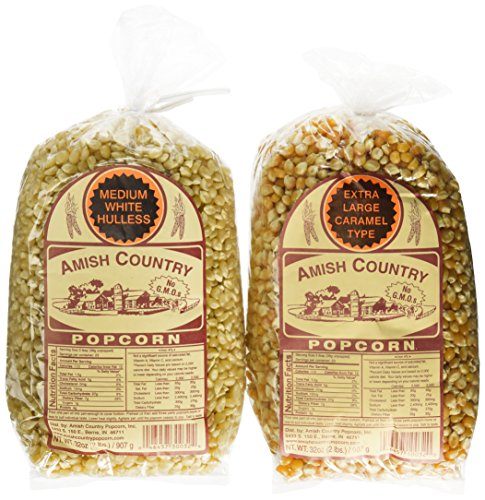 -. Title : Amish Country Popcorn Variety 2 Bags 2 Lbs Each Total 4 Lbs Non Gmo, Extra Large Caramel Type, Medium White Hulless