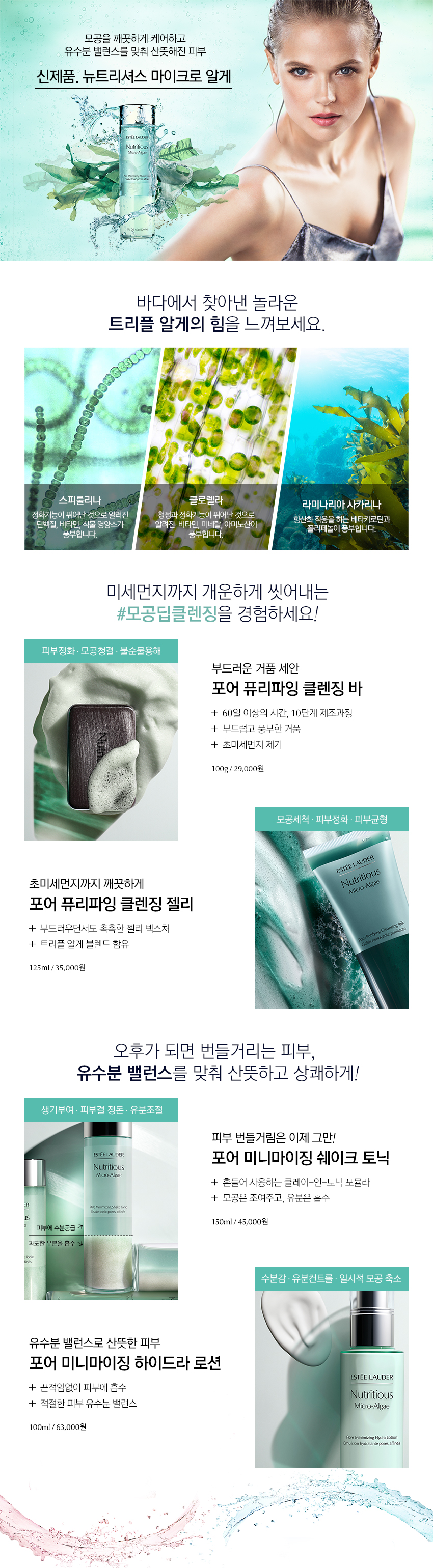 프랑스 청정지역에서 추출한 클로렐라, 스피룰리나, 라마나리아 사카리나 세가지의 특별한 알게는 피부 정화 및 피부에 유수분 밸런스를 맞춰주어 모공에 과도한 유분은 제거하고 더욱 산뜻해진 피부로 가꿔줍니다.