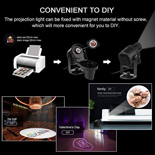 ◆2017 New DIY Pattern Projector Light◆:The main feature DIY of this led projector can bring more fun to you !you can choose any pictures what you like. however ,you need to pepare a printer , use art-based software such as PS to create the design of your custom gobo. Then use trasparency film base to print it and install it into the projector.Also , this led projector light comes with 30pcs different film patterns ,6pcs had installed on rubber gasket,24pcs printed on the trasparency film base .