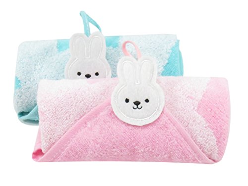 THE SPECIFICS: Pack of two adorable rabbit towels in pink and blue, measuring 12” x 12”.