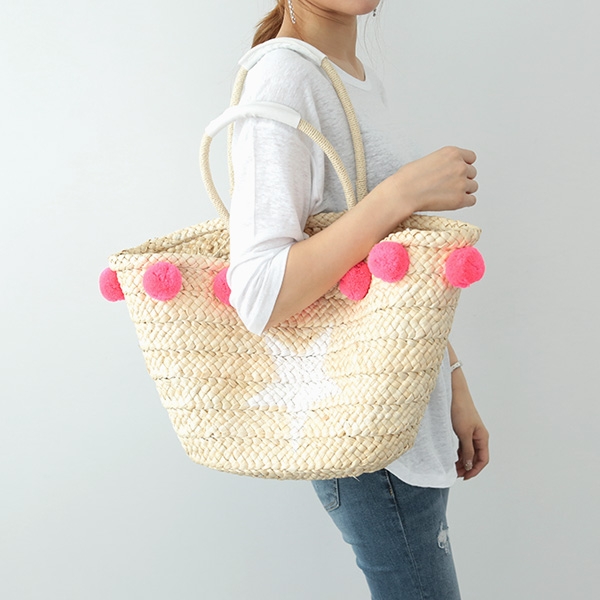 |  폼폼이가 붙어있는 시원한 왕골백! 봄, 여름에 가볍게 들거나 바캉스룩에 포인트로 매치하시기 좋은 아이템이에요 자연스러운 컬러에 촘촘하게 엮인 왕골 밀집으로 상단에 폼폼이가 달려있어 사랑스러워요 가방 프론트에 별 모양 프린트와 귀여운 방울이 달려있어 밋밋하지 않답니다. 미디움 사이즈로 딱 각이 잡혀있어 소지품을 넣어 정리하기도 편해요 손잡이 길이는 토트백으로도 숄더백으로도 들 수 있도록 적당하구요 폼폼이 컬러가 핑크, 민트 두가지 색상으로 준비되어 있어요 상세페이지에서 디테일 확인 후 굿 초이스 하세요!       | COLOR | 핑크 / 민트 | | 제품 색상은 모니터에 따라 실제 색상과 차이가 있을 수 있습니다. | | | | FABRIC | 비스코스 | | | | PRODUCT ION | 제조국 / 중국 | | 품질보증기준 / 소비자분쟁 해결기준에 따름 | | A/S 책임자 및 고객센터 / 감성가방 | | | | SIZE INFO | 사이즈는 측정 방법에 따라 1~2cm의 차이가 있을 수 있습니다. | | 스트랩 길이는 연결 고리를 제외한 길이이며, 최대 길이입니다. | | (단위:cm, g) | | 가로 길이 | 세로 길이 | 너비 | 손잡이 높이 | 스트랩 길이 | 무게 | | 45 | 30 | 18 | 23 | - | 370 |  |