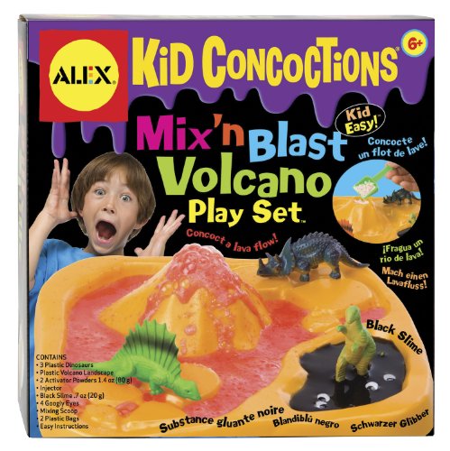 ALEX Toys - Experimental Play, Kid Concoctions, Mix N' Blast Volcano Play Set Science Kit 968 lets you create a prehistoric landscape that explodes with lava! By mixing the (2) lava powders and adding water, you can watch this volcano erupt again and again over 20 times! While lava is flowing, march (3) plastic dinos through the black slime pit! Includes plastic volcanic landscape, (3) dinosaurs, (2) lava powders (1.4-ounces, 40-grams each), injector, black slime (.7 fluid-ounces, 20-grams), (4) googly eyes, plastic lava shovel, (2) resealable bags and easy to follow instructions. ALEX is renowned for producing quality craft projects for children of all ages, and this year is no exception. Our signature detail and creativity continues with wonderful new introductions, turning classic crafting into modern projects with a sophisticated look and finish. Parents love the quality ALEX puts into traditional crafts, and kids love that we make them trendy! ALEX Toys - Experimental Play, Kid Concoctions, Mix N' Blast Volcano Play Set Science Kit 968 is recommended for age 6 and up. ALEX Toys takes the mission of providing children with quality creative products that foster personal expression and build self-esteem to heart! ALEX products are currently sold in over 80 countries worldwide in specialty toy and retail shops. Visit www.amazon.com/alex-brands for more information on Alex Brands and our best-selling line of educational and entertaining products for kids.Feature