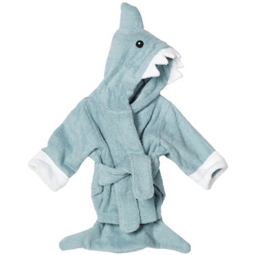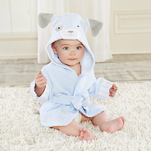 When a hooded spa robe for baby is this "doggone" cute, you just know it came from Baby Aspen designers, whose talent with terrycloth shows up in "detail!" Puppy themed hooded bath robe is light blue, with light blue and white-striped cuffs, a puppy's face with gray beige and white embroidered features gray beige 3D ears on the hood, a terry tie at the waist and a gray beige puppy dog tail peeks out from the back of the robe Machine washable terrycloth Size 0-9 months