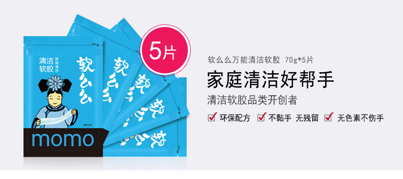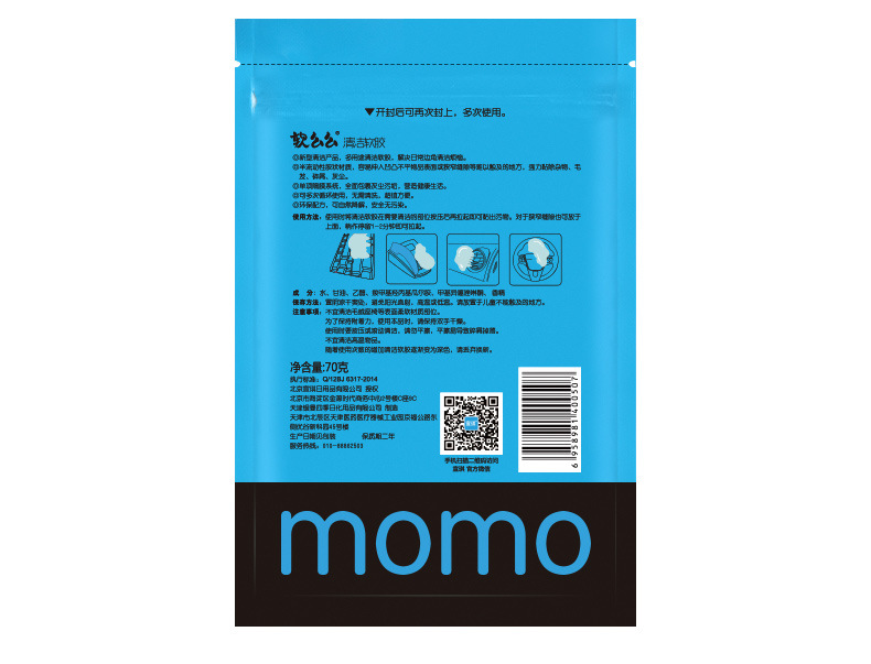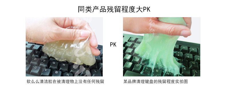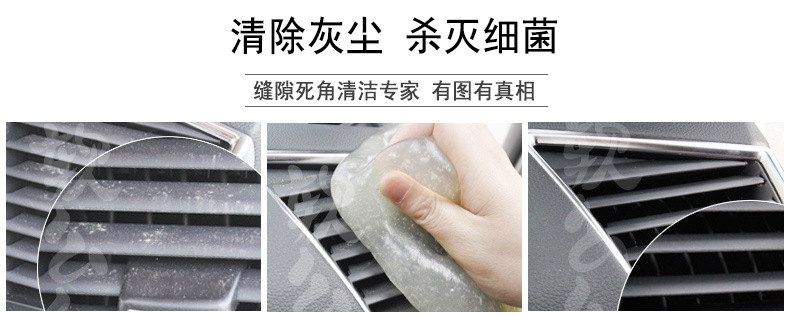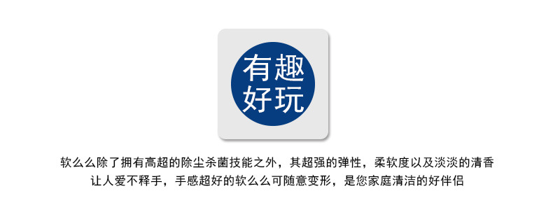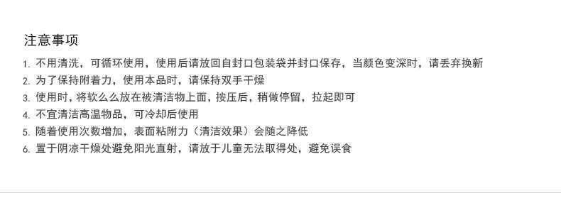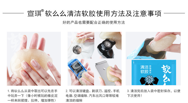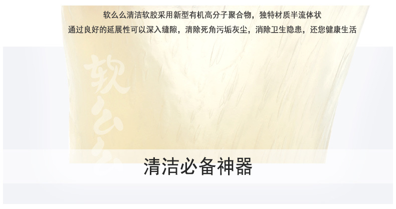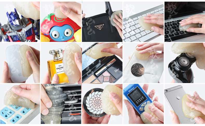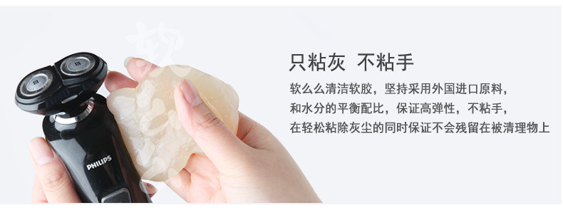 产品功效:革命性清洁产品,创新多用途软胶,清洁功能绝非传统清洁用品可比拟:半流动性材质,轻易伸入凹凸不平物品表面或狭窄缝隙等难以触及的地方,强力黏除杂物、毛发、碎屑、灰尘,并留有淡淡清香:单项隔膜系统,全面包裹灰尘细菌,有效清洁并杀死常见细菌,营造健康生活:可多次循环使用无需清洗,超值方便:环保配方可自然分解,安全无污染。使用方法:使用时将清洁软胶放于物品表面,用手轻轻滚动或按压后再拉起即可黏出污物,对于狭窄缝隙也可放于上面,稍做停留1-2分钟即可拉起。