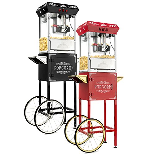 Enjoy making gourmet, movie-theatre style popcorn anywhere with the Olde Midway antique style popcorn machine and deluxe cart. Offering nostalgic charm with a retro-style design, this premium-quality popcorn machine is equipped with completely modernized features for convenient, easy operation and lasting functionality. Ideal for adding novelty at school and church fundraisers and carnivals, businesses, parties, little league and varsity games, home movie theatres, and much more, this 8-ounce kettle can produce about 3-gallons of popcorn per batch to satisfy large crowds. Also makes a great gift for movie buffs. Constructed of highly durable materials including heavy-duty powder coated steel and stainless steel food zones, tempered safety glass walls, vibrant, richly pigmented premium paint, and a powerful but whisper-quiet motor, this deluxe popcorn machine is built to last. Heavy-duty cart with high-quality hinges and handles provides convenient storage space for popcorn and accessories, and is easily portable with its large 16", bicycle-style, ball-bearing wheels. Durable welded legs with rubber-capped feet provide stability on all types of floors, as well as protect floors from scuff marks. Convenient 3-switch operation includes a spot light warmer, stirrer, and pot heater. Machine includes a warming deck and heat light to keep popcorn fresh and delicious, as well as a drawer to catch any un-popped kernels for a perfect batch every time. Cleans easily with water, and runs on a US-standard 120 volt power cord for quick and easy setup almost anywhere. Includes the following stainless steel accessories: ½ cup measuring cup, tablespoon, popcorn scoop and salt shaker.Feature