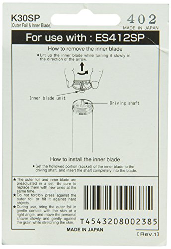 The K30SP Cleancut Shaver Replacement Parts Package includes a new Blade Assembly, Slotted Foil Head (screen) and Protective Cap (three piece set.) All the parts you need to renew your ES412 Cleancut. Easy to install. Just screw the foil off your ES412 Cleancut Shaver and lift the old Blade Assembly off the shaft. Place the new Blade Assembly on the shaft and screw the new Foil Head on. Presto..you're done! Your ES412 Cleancut is as good as new. Package also includes a new protective Clear Plastic Cover that goes over the Foil Head to prevent damage to the foil between uses. Note: Depending upon use, the Blade Assembly and Foil Head should last anywhere from 6 months to two years depending on use. NOTE: For use with the Model ES412 Cleancut Shaver only...will not fit the Model ES1080 Cleancut Shaver.Feature
