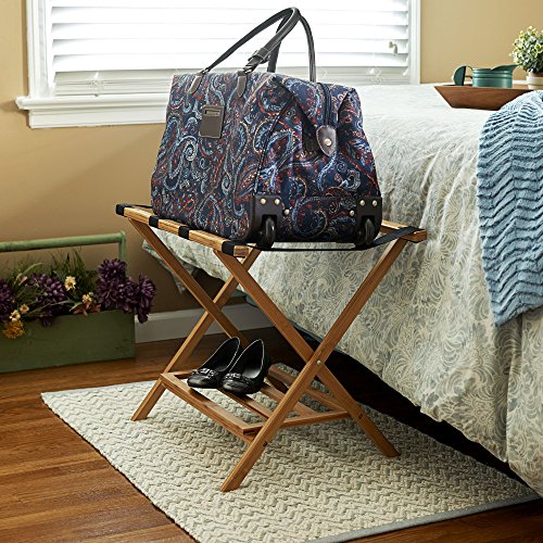 Studio : Household Essentials Publisher : Household Essentials Binding : Misc. Product Description Household Essentials Bamboo Luggage Rack is a beautiful and charming way to welcome guests. This collapsible luggage rack stores folded up fits in just about 2-inches of space, so it easily stores in closets or behind the door. The luggage rack unfolds easily and sets up on a sturdy X-frame. 4 black straps create the rack's top and provide a clean and safe place on which to lay a suitcase. This clever rack also has a fold down shelf underneath to hold shoes, cosmetic bag, or other sundry. It is easy to assemble and lightweight. So welcome out of town guests or keep your own space accessible and convenient with this beautiful, high-class luggage rack with fold-down tray. It is 19.88 inches high, 25.98 inches wide, and 16.93 inches deep: the perfect size for convenient and comfortable use. 0