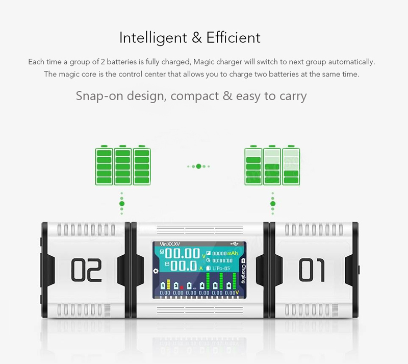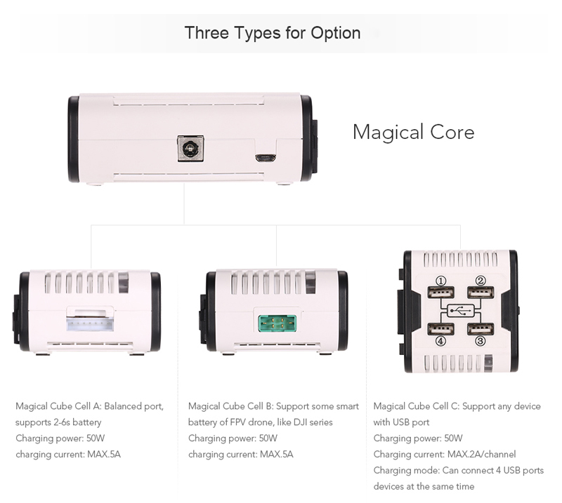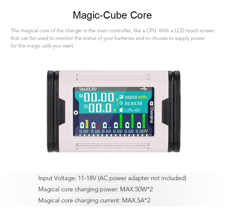 Consist of a 100W 10A main magical core and a 50W 5A magical Cell-A cube, support 2-6s balance port battery.