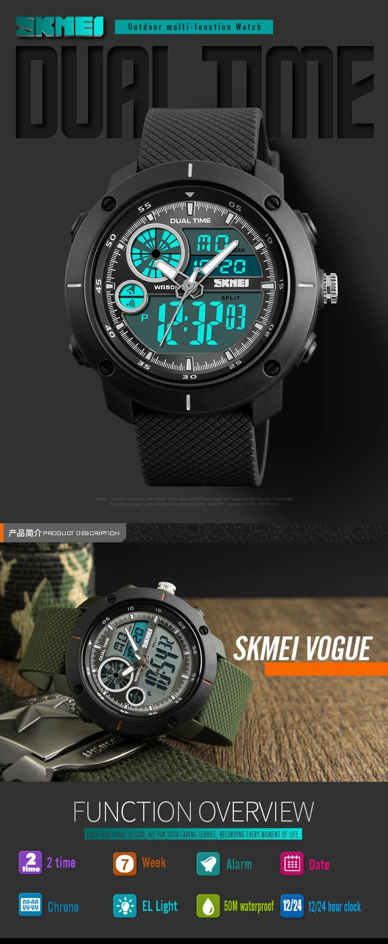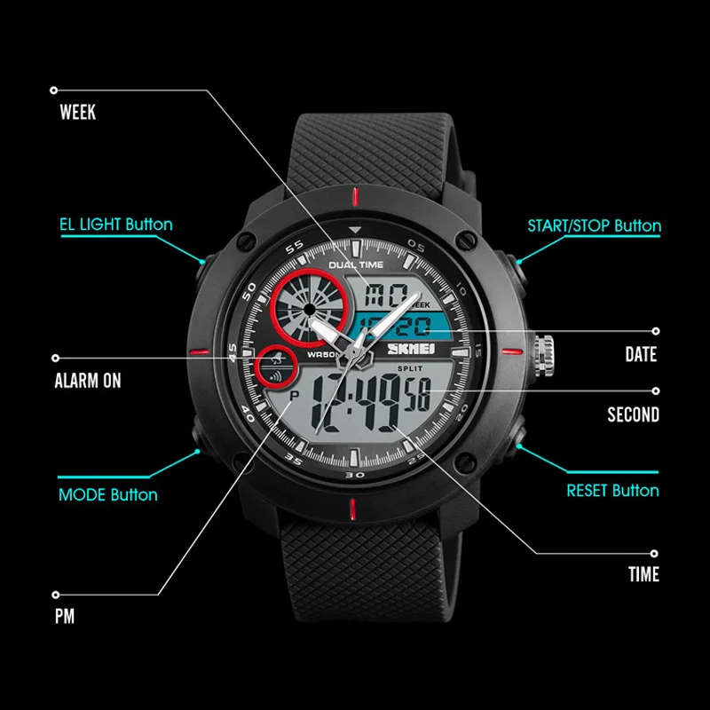 Feature:Water Resistant,LED display,Multiple Time Zone,Stop Watch,Back Light,Shock Resistant,Chronograph,Auto Date,Week Display,Alarm