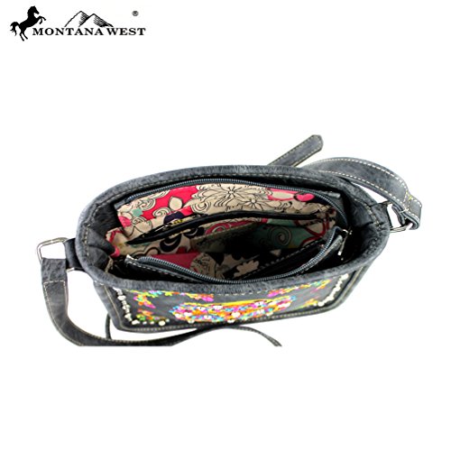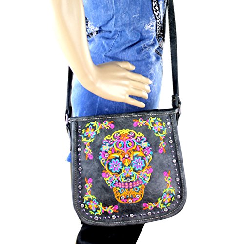 -. Brand : Montana West -. Department : womens -. Feature : Size:10" x 3.5" x 9" (23). Inches / .Made of the Vegan leather , this western handbag has:.Colorful embroidery sugar skull.Floral embroidery with rhinestones and silver embellishments.Inside single compartment divided by a medium zippered pocket. / Inside of bag include a zippered pocket and 2 open pockets.An open pocket on each side.An open pocket and zippered pocket on the back.Metal feet on the bottom for protection and stability.Single and adjustable strap.10" x 3.5" x 9" (23). -. PackageQuantity : 1 -. ProductGroup : Shoes -. ProductTypeName : HANDBAG -. Title : MW326-8287 Montana West Sugar Skull Collection Handbag