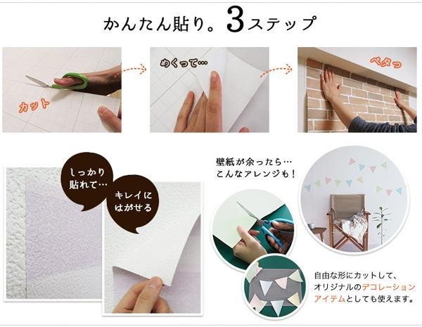 | ウラ紙をはがして貼るだけの簡単施工でお部屋のイメージを簡単にチェンジ☆はがした後ものり残りしない壁紙です。F☆☆☆☆認定取得製品です。 |