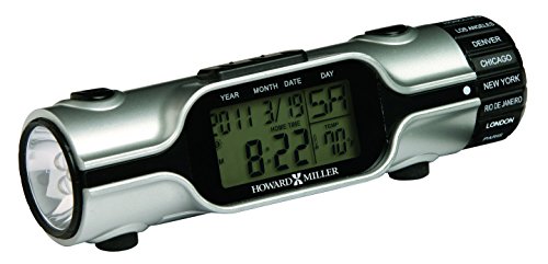 The Illuminated world time clock is a clever world time travel alarm clock doubles as a LED flashlight. Choose the time to display from 18 major world locations. The LCD display is viewable in 12/24 hour time format, shows the current time, month, date, day of week, year and indoor temperature in F or C. Automatically adjusts for daylight savings time. Display in five different languages English, Spanish, German, French or Italian. Quartz, snooze alarm movement includes three LR44 sized batteries for the flashlight and two AAA sized batteries for the clock. Available in metallic silver finish with black trim. Measures 1-1/2-inch height by 5-1/4-inch width by 1-1/2-inch depth.