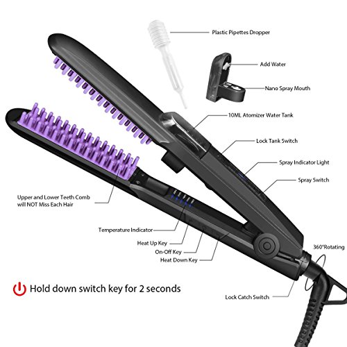 - 2. 30 seconds while the speed of hot and then add fog of water, let that steam hair straight comb user directly reached to the physical straight hair effect, use of the process is don't worried about overheating lead to hair loss. nanotechnology fog moisture,Release rich negative ions when straightening and shining curly or frizzy hair, eliminating frizz and adds shine, reducing knots and split ends, make your hair not only straight but also smoother healthier