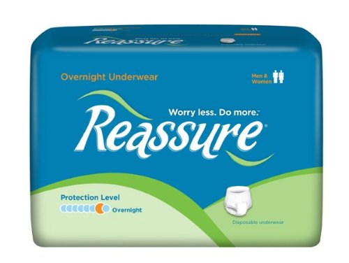 -. Binding : Health and Beauty -. Brand : Reassure -. Feature : Large size fits 36-50" waist/hip / A lower-rise design prevents bunching around the waist. / Skin-Soft Lining pulls moisture away from the skin for greater comfort. / A generous amount of Gel-Dry Polymer locks away odor and moisture, keeping your skin dry. / Leakage Guard Elastic inner leg cuffs provide additional protection and close fit. -. Label : Reassure -. Manufacturer : Reassure -. PackageQuantity : 64 -. ProductGroup : Health and Beauty -. ProductTypeName : HEALTH_PERSONAL_CARE -. Publisher : Reassure -. Studio : Reassure -. Title : Reassure Overnight Underwear, Large (64)