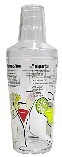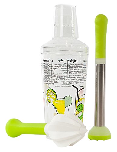 -. Feature : Acrylic 16.7oz Cocktail Shaker printed with 5 popular bilingual Cocktail recipes (English and French) / Set includes: a Cocktail Muddler and citrus reamer / Cocktail Shaker top cap doubles as a measured jigger, up to 50ml/1.75oz / BPA-free, lead-free and food-safe
