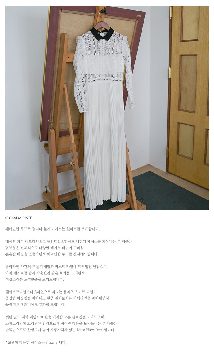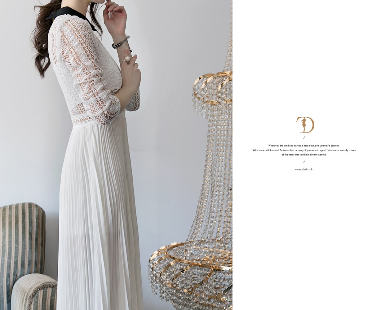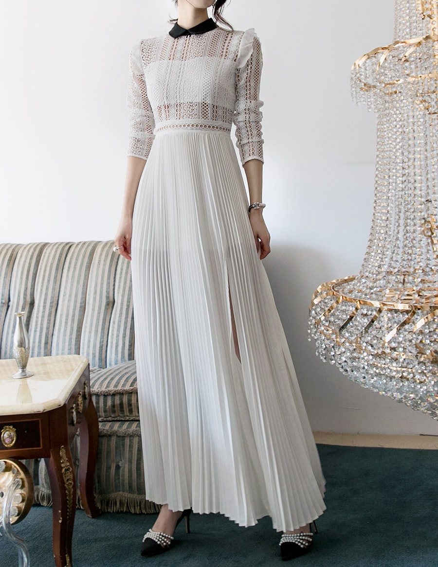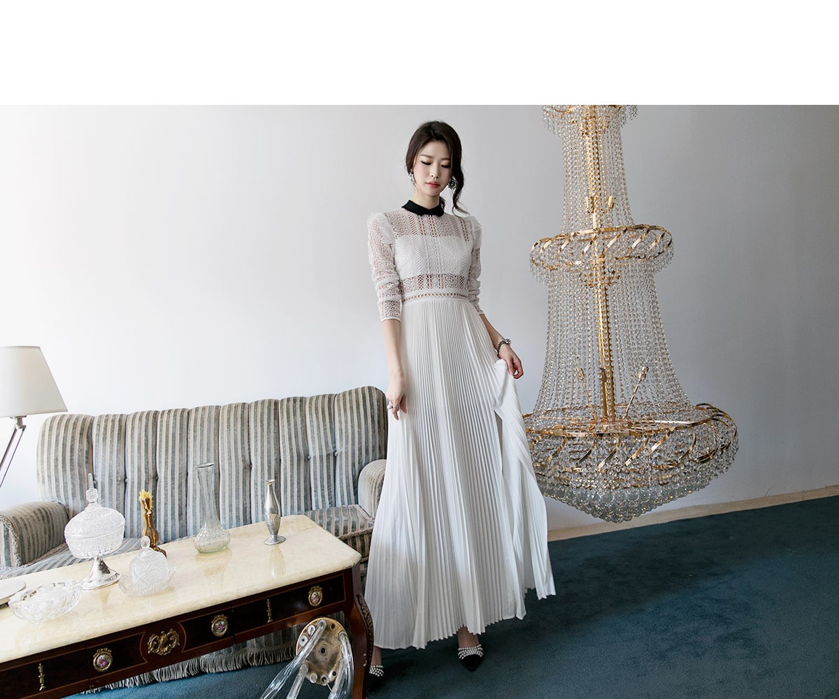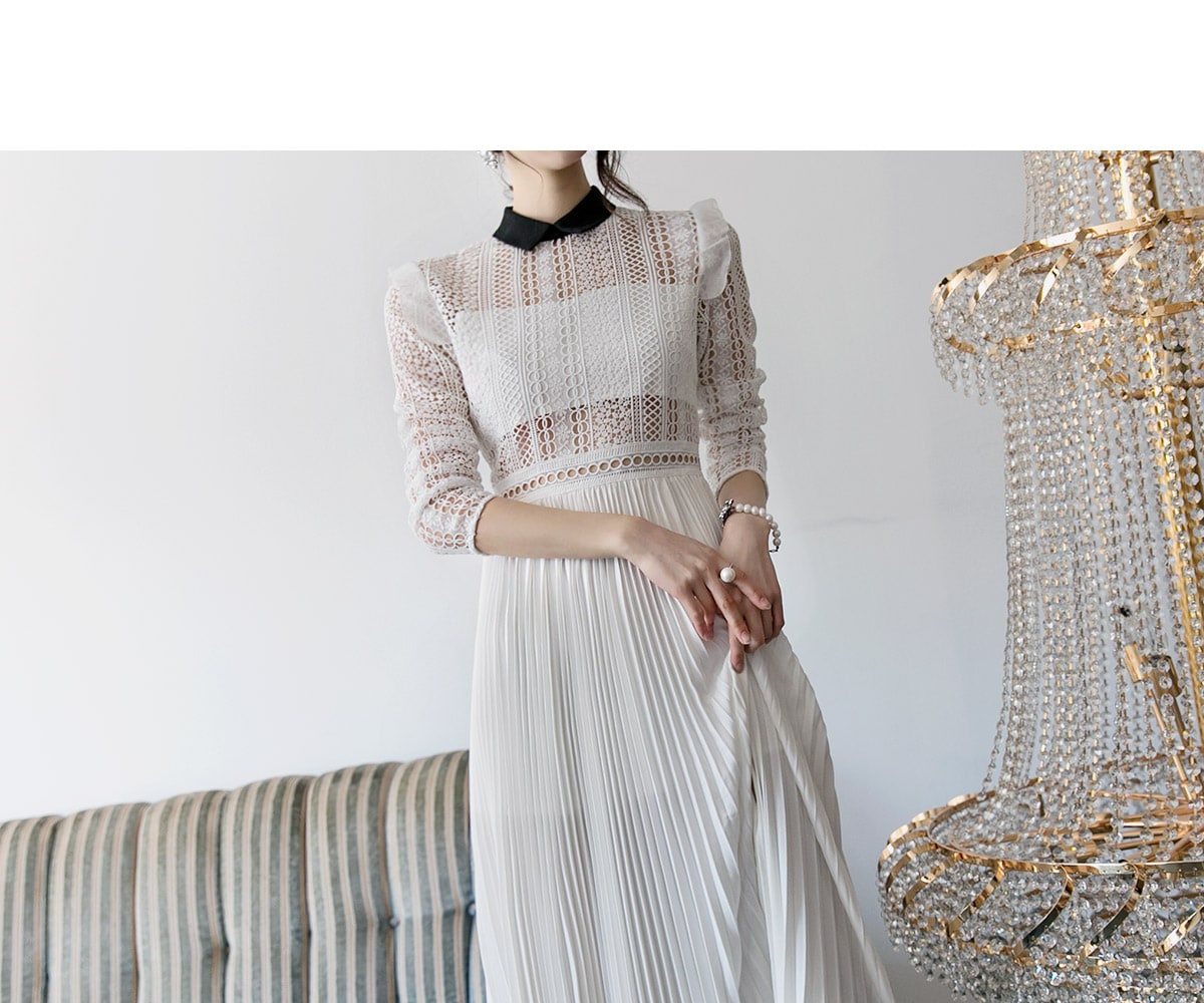 D3512 카라 라인 레이스 플리츠 롱 원피스 Ivory