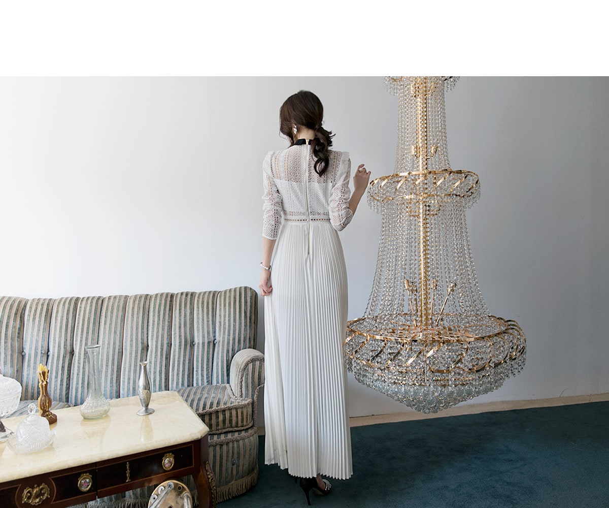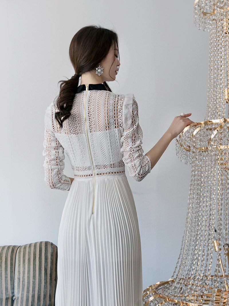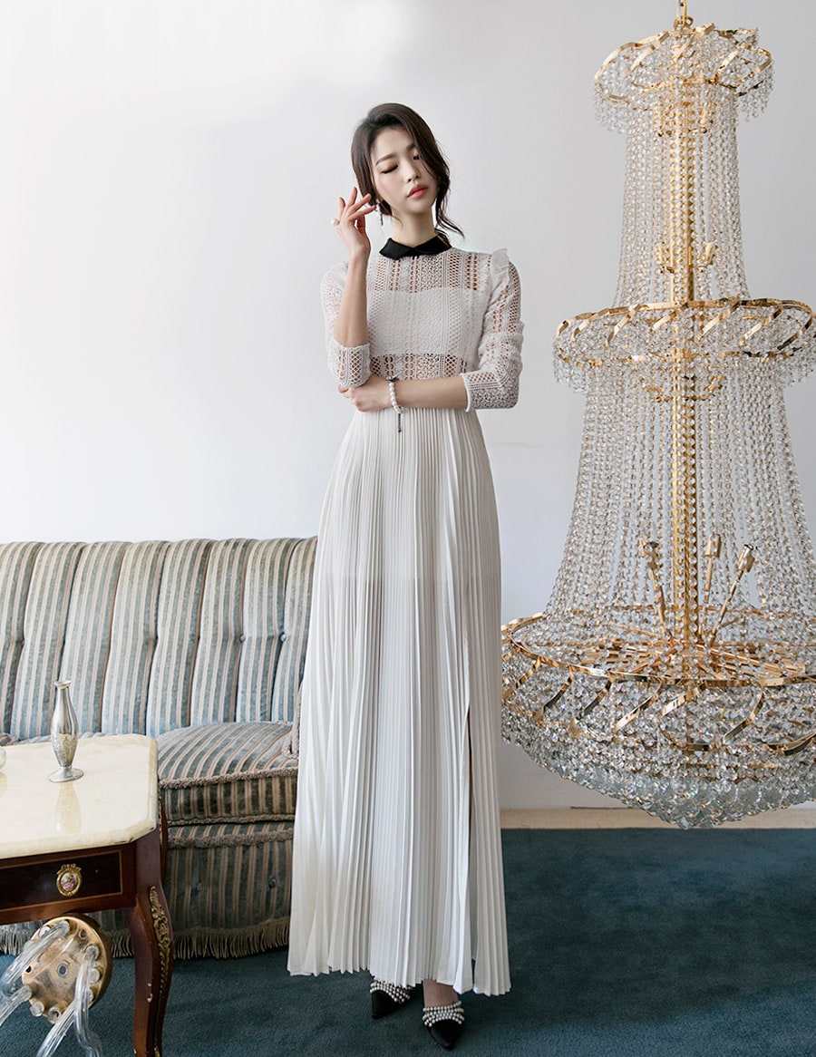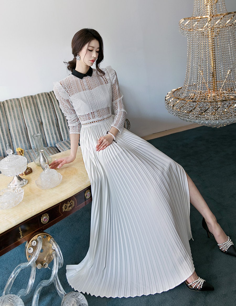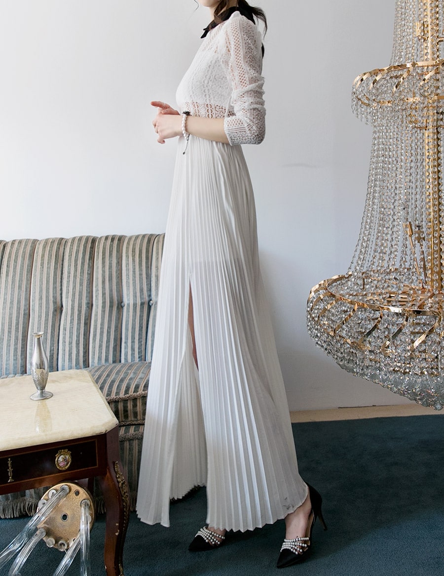 D3512 카라 라인 레이스 플리츠 롱 원피스 Ivory