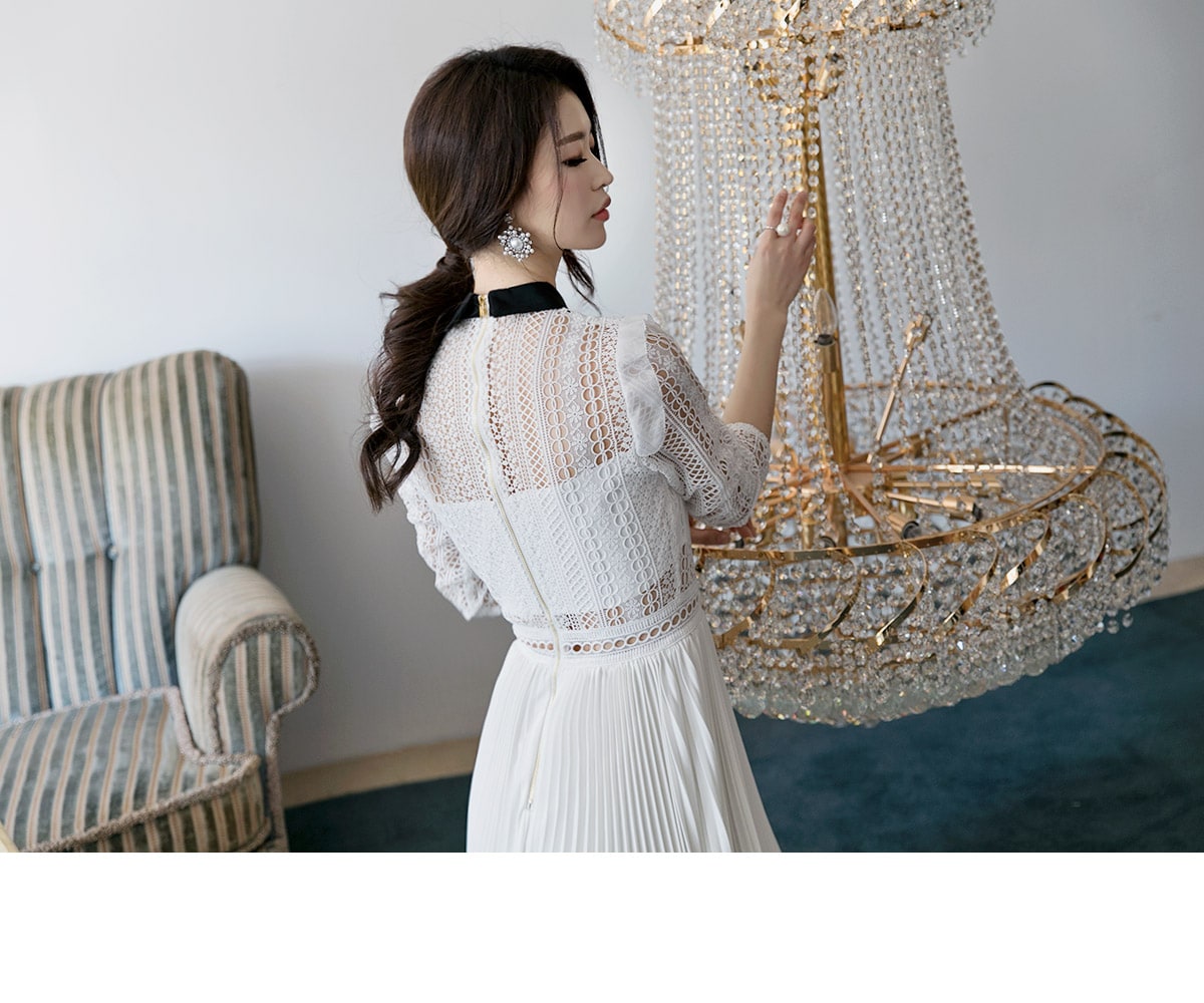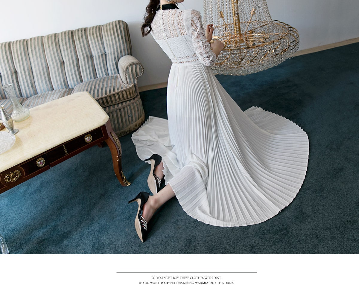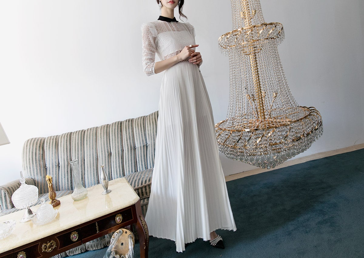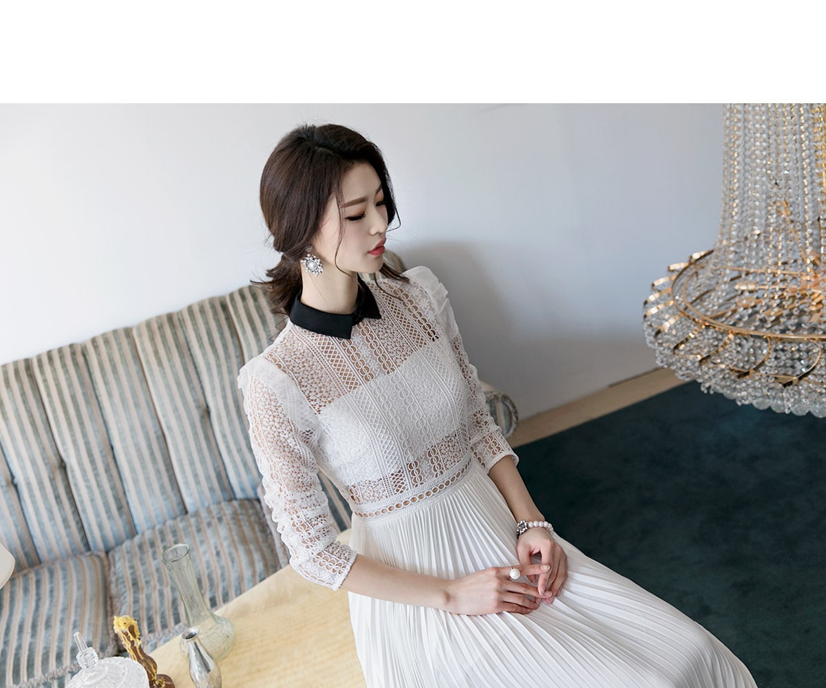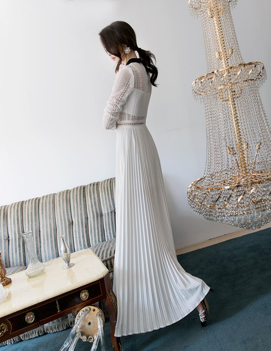D3512 카라 라인 레이스 플리츠 롱 원피스 Ivory