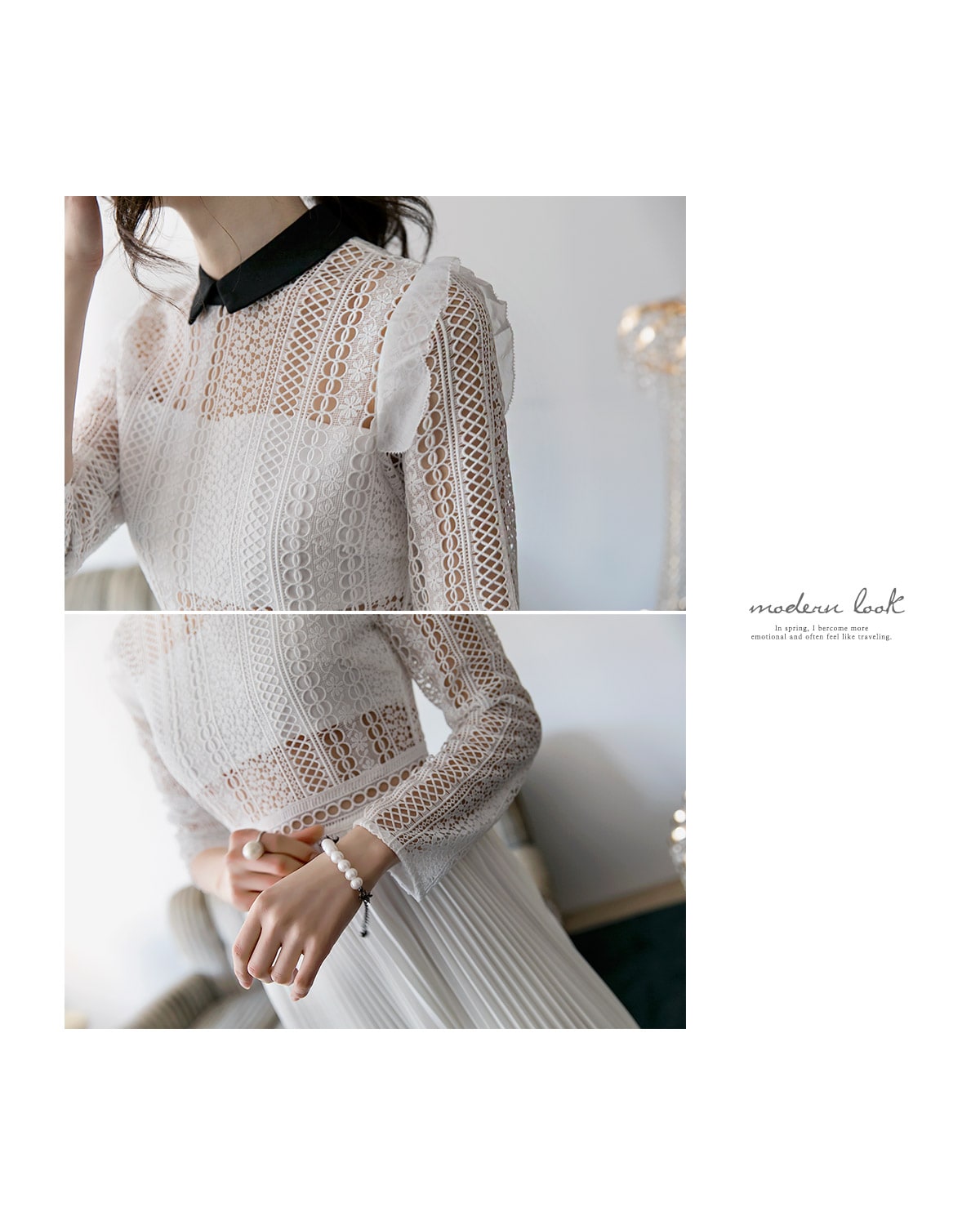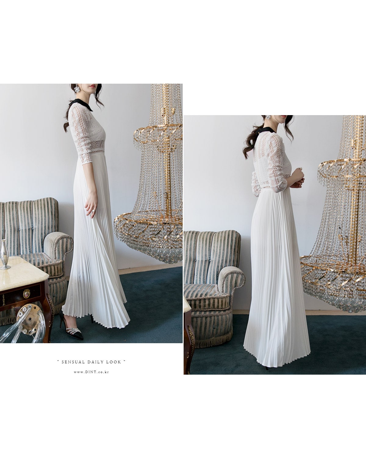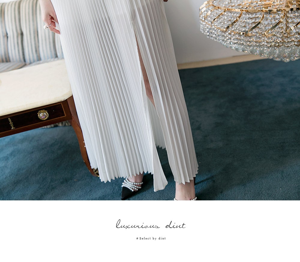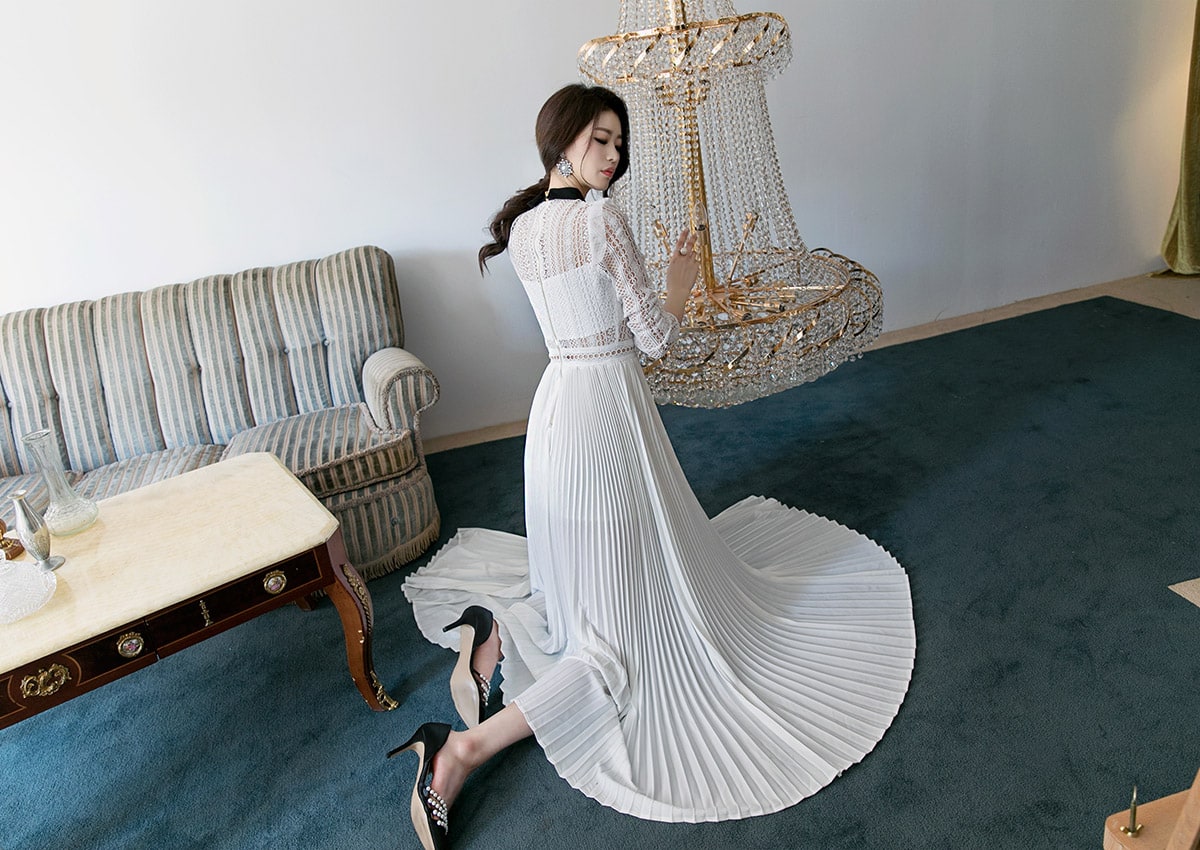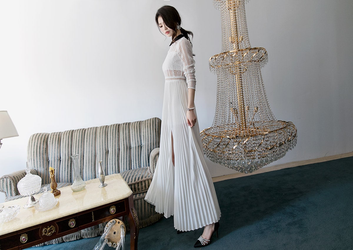 D3512 카라 라인 레이스 플리츠 롱 원피스 Ivory