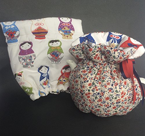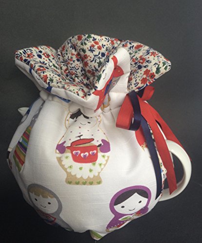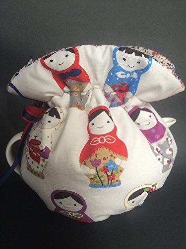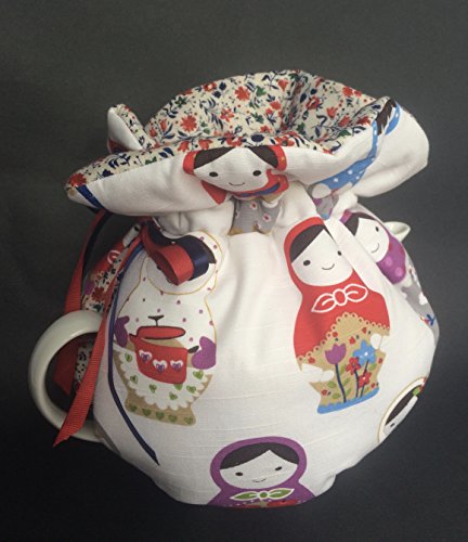 Product Description Reversible Tea Cozy cotton in a beautiful Russian nesting doll - Matryoshka doll The cozy has a tie pull top with a satin ribbon tie top that easily adjusts to many size tea pots med standard size to med/large.6-10cup The bottom of the cozy has an elastic bottom that can have the pot sitting on the elastic or pulled over the bottom on the tea pot to sit flat on the counter. The colours are bright in purples, blues, greens and red on a white background. The inside is a sweet little floral print. 0
