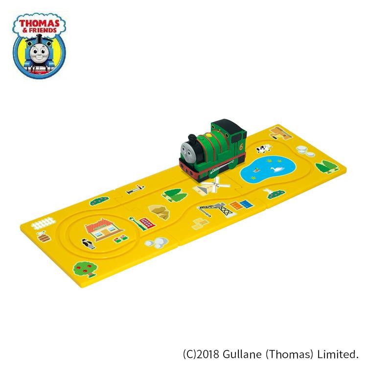 3枚のパネルでコースを作り、パーシーを走らせるセット。付属のシールを貼って自分だけの情景が楽しめます。パーシーがコミカルに動きます。 |