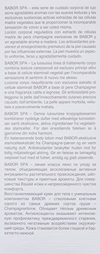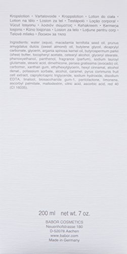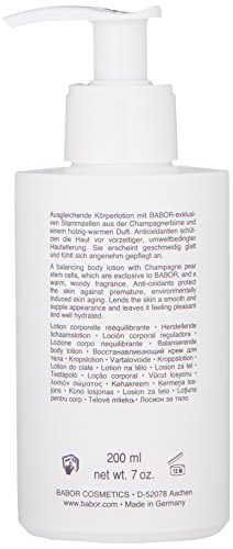 For Very Dry Skin. A light, balancing body lotion with a warm, woody fragrance. Soothing Body Lotion is ideal for the regular care of body skin. It absorbs fast and leaves skin feeling soft, smooth, supple and beautifully groomed. An Extract of Champagne Pear Stem Cells exclusive to BABOR, Vitamin E and Argan oil protect the skin against premature, environmentally induced skin aging and promote the rejuvenation of the skin’s protective barrier. Skin is left looking smooth and supple, and feels beautifully conditioned and pleasant to the touch. Leaves skin looking hydrating and refreshed. Made with all natural key ingredients such as: Sweet Almond Oil, Macadamia Oil, Vitamin E, Agran Oil, Shea Butter, Provitamin B5, Avocado Oil, and Pear Stem Cells. All BABOR products are CRUELTY FREE and Never Tested on Animals. Vegan. Made in Germany. BABOR is the 2nd most sustainable luxury brand in Germany.Feature