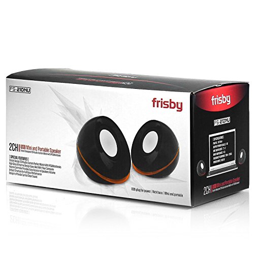 Frisby FS-210NU USB speaker system offers great sound quality with powerful 4 watt RMS. Speaker system does not require a wall power outlet, since it receives power directly from your computer or laptop's USB port, which means that FS-210nu uses 5 volt and consumes very low electricity. It has excellent sound quality for the price we are offering. Frisby FS-210NU speakers are quite portable. Weight is less than one pound, so they're extremely light weight, and they can be carried during traveling quite easily. Compatible with all type of PC and laptop models. Simply plug and play. The system is complete, and comes with all necessary cables, and accessories to hook your speaker system up to your computer, or laptop. System is very small size but it has powerful, rich and clear sound. The speaker system is magnetically shielded to provide the greatest protection against image distortion on a computer monitor. Requirements : Any 3.5 mm (1/8") audio jack source and USB connection (all PC and laptops has 3.5 mm audio jack).Feature