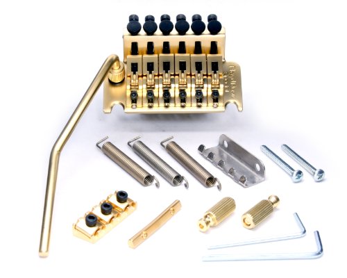 Studio : Floyd Rose Publisher : Floyd Rose Product Description Special Series Tremolo Bridge with R3 Nut Satin Gold. "The Floyd Rose Special Series Locking Nut R-3 is an Authentic version of a licensed Floyd Rose tremolo system manufactured in Korea exclusively for Floyd Rose. The Floyd Rose Special maintains the construction parameters and features of an Original Floyd Rose, while utilizing zinc alloy saddles in place of steel and a zinc alloy sustain block in place of brass. The design specifications and high quality materials of the Special Series Floyd Rose bridge will hold up to the demands of today's performers. The R3 Nut is designed for guitars with neck widths of 1-11/16"" (42.90mm) and a 10"" radius." 0