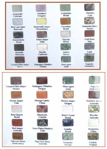 -. Feature : It's a Little Gem! Actually, it's a set of (36) different little polished gemstones and minerals from around the world, all identical sizes (1/2" x 3/8" x 1/8" thick), mounted and identified by name and origin on an 8" x 10" card. / Super nice at a super price, for teachers, designers or jewelry makers. / The set includes amazonite, amethyst, aventurine, black obsidian, blue lace agate, buttermilk jasper, carnelian, Dalmatian dacite, dumortierite, fancy jasper, fluorite, gold stone, hematite, howlite, jadeite, lapis, leopard skin jasper, mahogany,obsidian, moss agate, nephrite, Picasso jasper, orange calcite, picture jasper, rainbow jasper, rose quartz, rhodonite, rock crystal, rhyolite, red jasper, snowflake obsidian, sodalite, serpentine, tiger eye stone, turquoise and unakite.