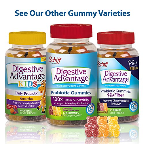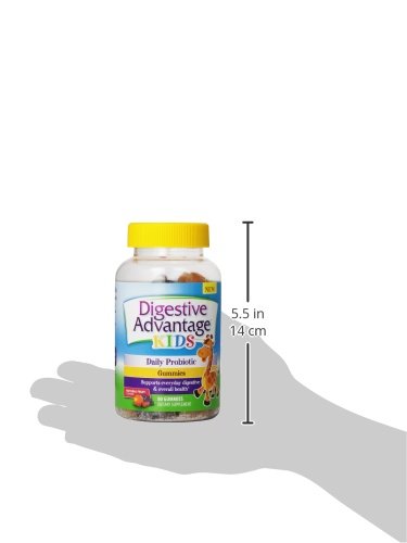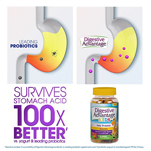 Digestive Advantage Kids Probiotic Gummies is the easiest and most delicious way to get your kids to take a probiotic. They are made with natural flavors and taste great so kids love them. And with no artificial flavors or colors parents love them too. They help support your child's everyday digestive and overall health and with continued use, gives them long-term digestive support*. Digestive Advantage Kids Probiotic Gummies help to lessen minor abdominal discomfort, bloating and may also relieve occasional diarrhea*. What are probiotics and does my child need one? Probiotics are beneficial bacteria that live in your digestive tract and promote digestive and immune health*. But many probiotics don't survive the harsh acidic stomach environment to get to the intestines where they do their work. But Digestive Advantage contains BC30, a patented probiotic that survives 100x better than leading probiotics and yogurt so it can deliver good bacteria where you need it**. *These statements have not been evaluated by the Food and Drug Administration. This product is not intended to diagnose, treat, cure or prevent any disease. **Based on median % survivability of Digestive Advantage probiotic vs. leading probiotic supplements and 19 probiotic yogurts in simulated gastric PH for 2 hours. Survivability and delivery of probiotic cells to the small and large intestines is one of the several factors influencing overall product effect.Feature