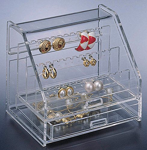 Store and display up to 18 pairs of earrings in this crystal clear acrylic earring case. At only 5.25 inches wide it takes up little space on your dresser while providing lots of storage for your jewelry. The jewelry holder features a bottom drawer for other jewelry items and a hinged clear door to keep your jewelry collection dust free. Earring Case Features 5.25 W x 4.5 H x 4.125 D inches. Has three tiers with drilled holes and notches for earrings. Holds 18 pairs of earrings. Convenient bottom drawer for storing other jewelry. Hinged cover keeps dust and dirt off of jewelry. Sticky foam attaches to drawer bottom for cushioning. Clear acrylic to identify and display your earring collection. Tidies your vanity and organizes your jewelry collection.