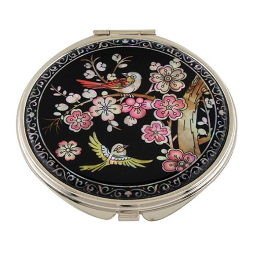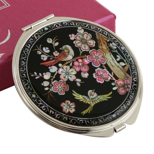 Mother of Pearl Pink Korean Plum Flower Tree and Bird Design Double Compact Magnifying Purse Mirror