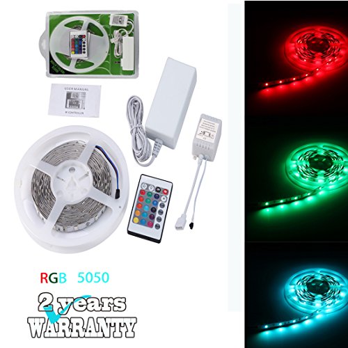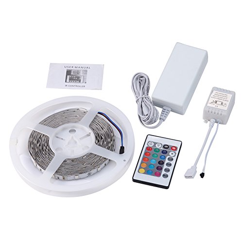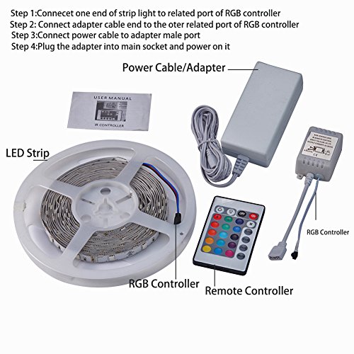 Package Contents: MONOCO 5M 5050-RGB-12VDC-LED Light Strip, Power Supplier,24 Key Remote Controller, User Manual