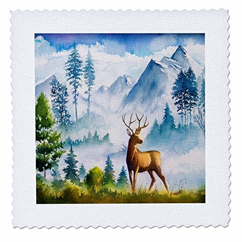 3dRose Watercolor Winter Mountain Scene with a Deer Quilt Square, 12 x 12"