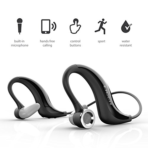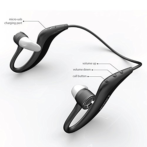 -. Feature : EASY FUNCTIONALITY controls are on the earpiece. Built-in Microphone. Functions like power on/off button, answering/ending calls, call-waiting, mute, volume adjustment, play/pause, and skipping/shuffling songs. / COMFORTABLE Never a burden to the ears. Rubber coating is comfortable to touch and wear, soft and skin friendly. Ergonomically designed, the ear hooks make the headsets fit your ear perfectly. Along with their rubber coating, these headsets hardly cause foreign body sensation when wearing. Friction has been reduced to a minimum on the condition that the earbuds can fit in ears firmly when doing sports and other high intensity activities. / HD SOUND: Perfectly transfer HD music. Super sound performance. Built-in microphone. Detailed voice instructions to guide you for easy using. / 4.1 BLUETOOTH CONNECTION supports multi-connection that allows for simultaneous use of the headphones with two mobile phones, recently updated Bluetooth with enhancements in coexistence, better high quality connections, and improved faster data transfer. Reconnects automatically when they are in proximity of one another. These wireless headphones can connect to iPhone 6 6Plus 5S 5C 5 4S, Galaxy Note 3 2 S4 S3 and Google, Blackberry, LG other Smartphones. / CHARGE Built-in rechargeable Lithium-poly battery. Micro USB to USB charging cable. Has a LED light indicator which turns red when charging and will turn blue when fully charged.