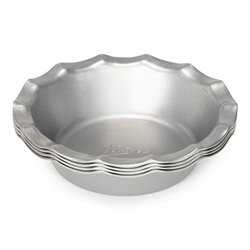 - 4 piece mini pie pan set, each pie pan is 4-3/8 inches in diameter, non-stick, designed and made in Europe