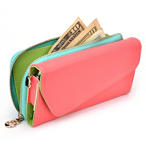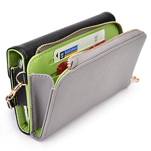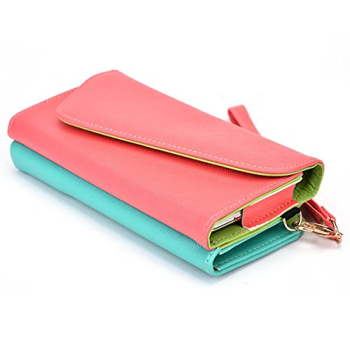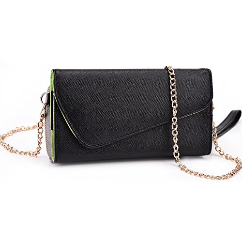 -. Feature : Money holder with 2 credit card slots / Universal smartphone compartment measures 6.60 x 3.70 x 0.50 inches / Precise real stitching / Detachable wrist and shoulder strap / Green pu leather interior