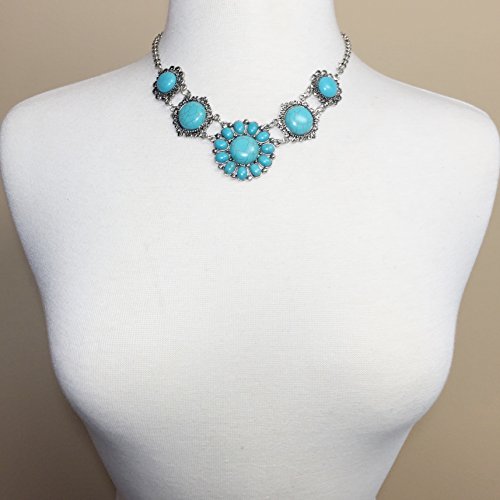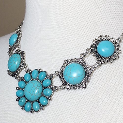 Simulated Turquoise Silver Tone Western Southwestern Look Necklace & Dangle Earring Set (Flower)