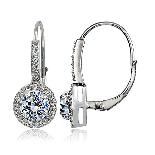 Drop earrings feature 6mm round shaped created white sapphire gemstones surrounded by smaller created white sapphire stones. They are secured by lever-back closures.
