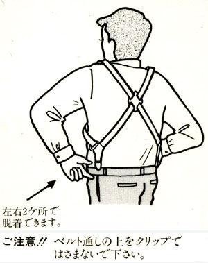 | ベルトと違って腹部に負担をかけずにズボンの前後をしっかりと支えるため、ズボンが最適な状態で吊り下がり、美しいシルエットを保つことができます。ズボンの折り目の延長上にフィックスすると、より足が長く見える効果も期待できます。 |